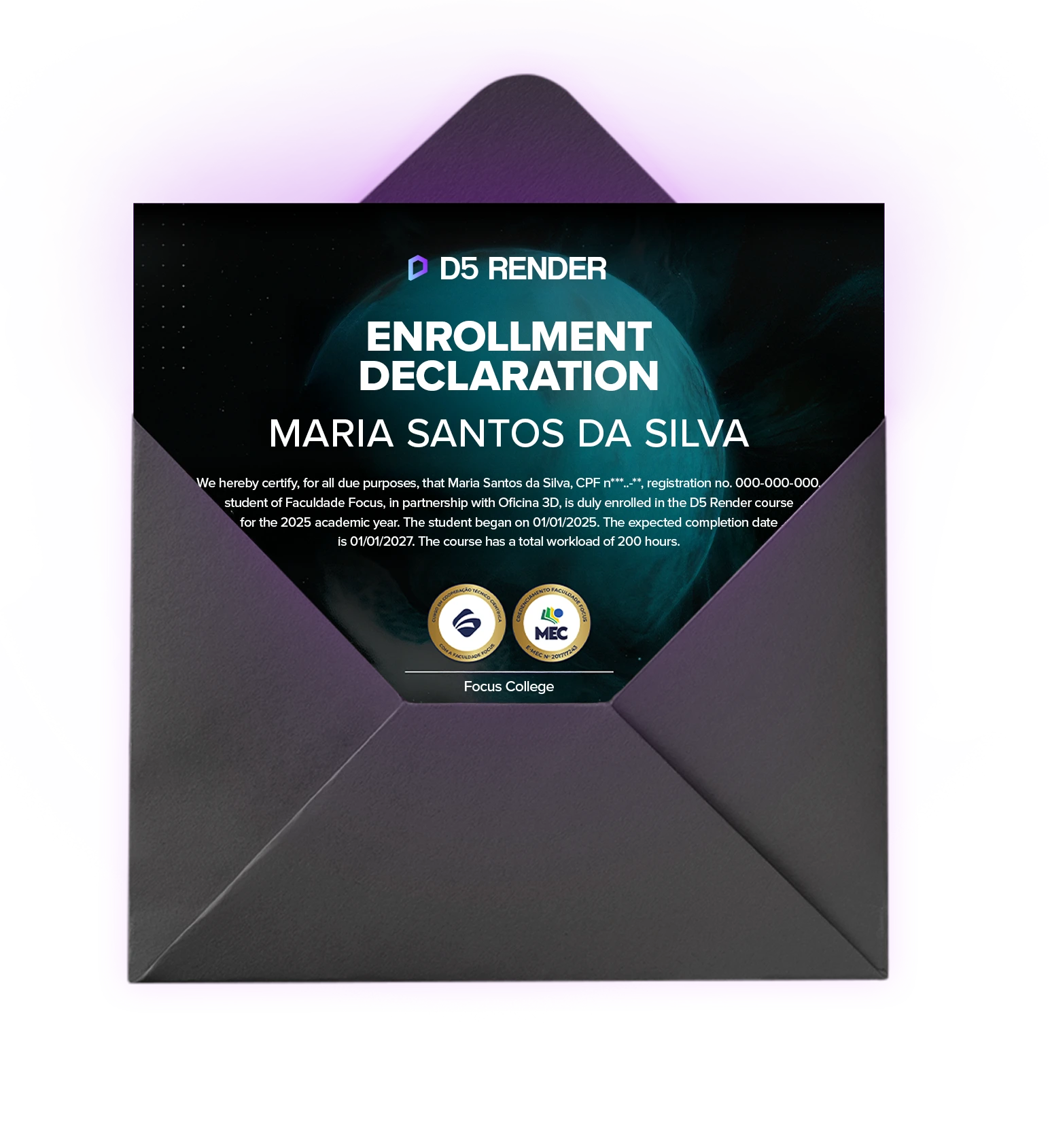 As a D5 Render student, you’ll be able to use your enrollment letter to apply for the student license of the program during your entire training.